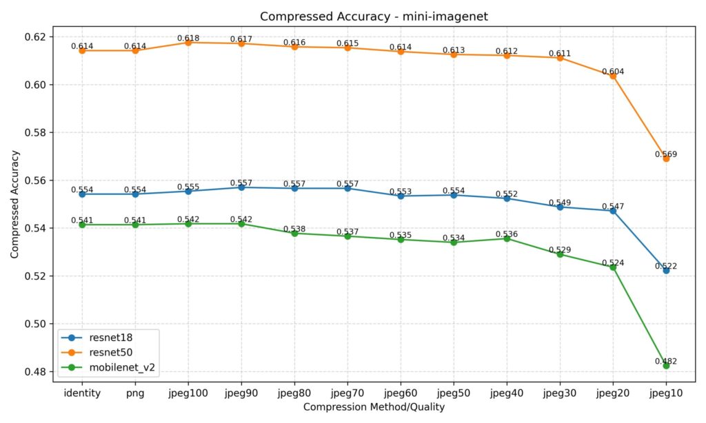 “Figure 9 shows the accuracy of ResNet-18, ResNet-50 and MobileNet-v2 with JPEG compression. Identity and PNG can be considered as baselines. This experiment shows that for all the models we have, with some compression, the image accuracy first improves, but after further compression, the accuracy drops.”